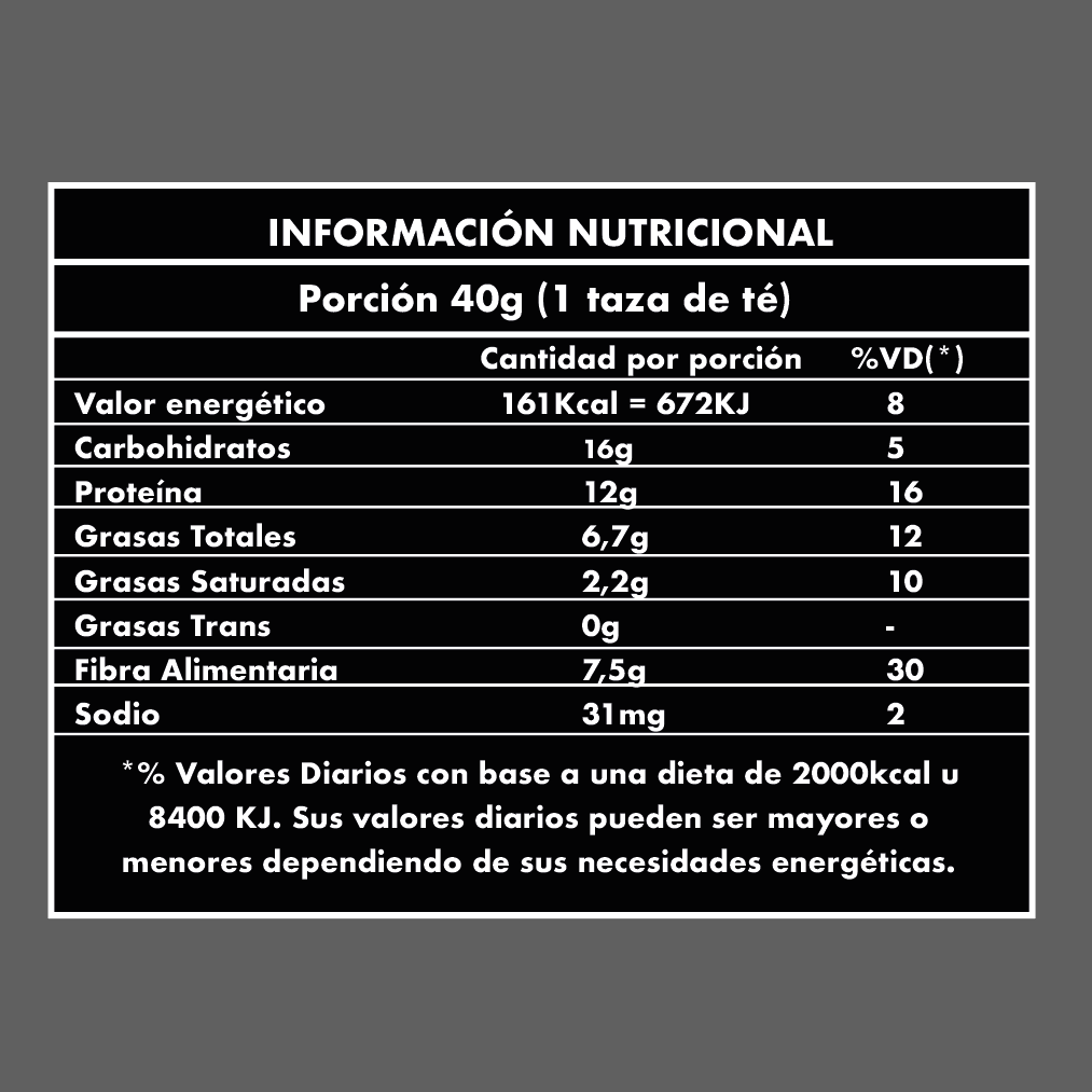 Ingredientes: Ingredientes: Inulina (fibra de raíz de achicoria), avena, pasta de maní, proteína de soja texturizada, proteína de arveja, dátil en cubo, almendras, símil chocolate semiamargo y coco rallado.