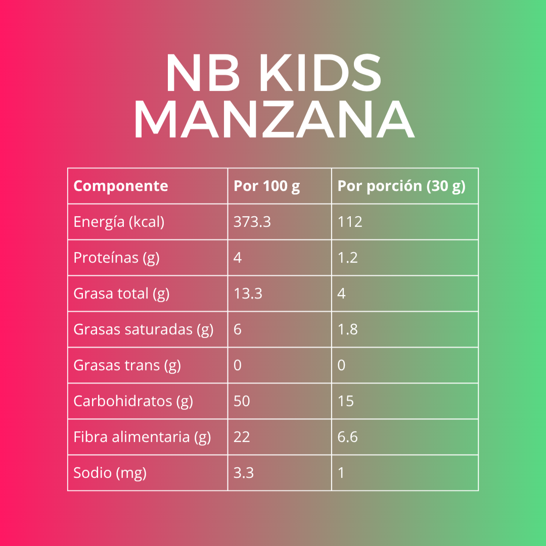 Ingredientes: Pasta de dátiles, pasta de maní, inulina, harina de avena, leche de coco en polvo, cacao y saborizante idéntico al natural sabor manzana.